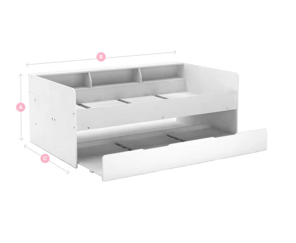 Made from high quality MFC and solid wood, the Kudl Day Bed will last and look great. The solid wood slats provide great mattress support so you can sleep soundly. At the back of the bed there’s storage shelves for books, toys, bedding or personal items so you can keep your room tidy and clutter free.