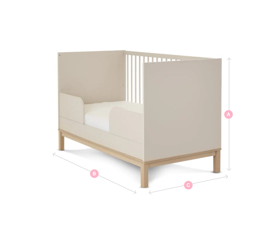This room set is available in two chic colour options: White and Natural, and Satin and Natural, ensuring a match for various nursery styles. The cot bed is designed to hold a mattress measuring 70 x 140cm, which is available separately.