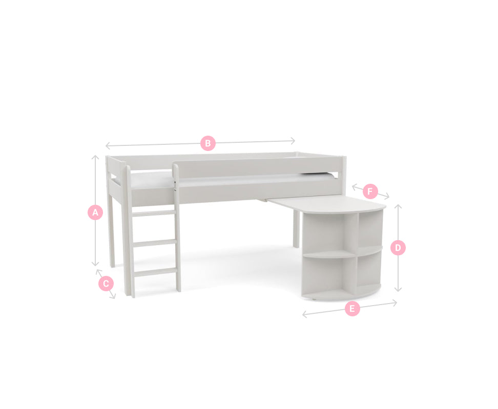 The Uno 1 Mid-Sleeper Frame offers a practical elevated design that creates a cosy nook underneath, perfect for a study space, play area, or additional storage. The pullout desk increases the functionality of the space and pushes easily back under the bed when not in use. The crisp white finish seamlessly blends with various bedroom themes, ensuring it complements any decor.