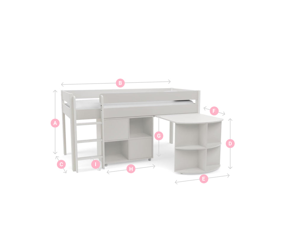 Introducing the Uno 1a White Mid-Sleeper Frame, featuring a convenient pull-out desk and a versatile cube unit—an excellent addition to your child's bedroom. This carefully designed frame enhances the space with its clean and timeless aesthetic.