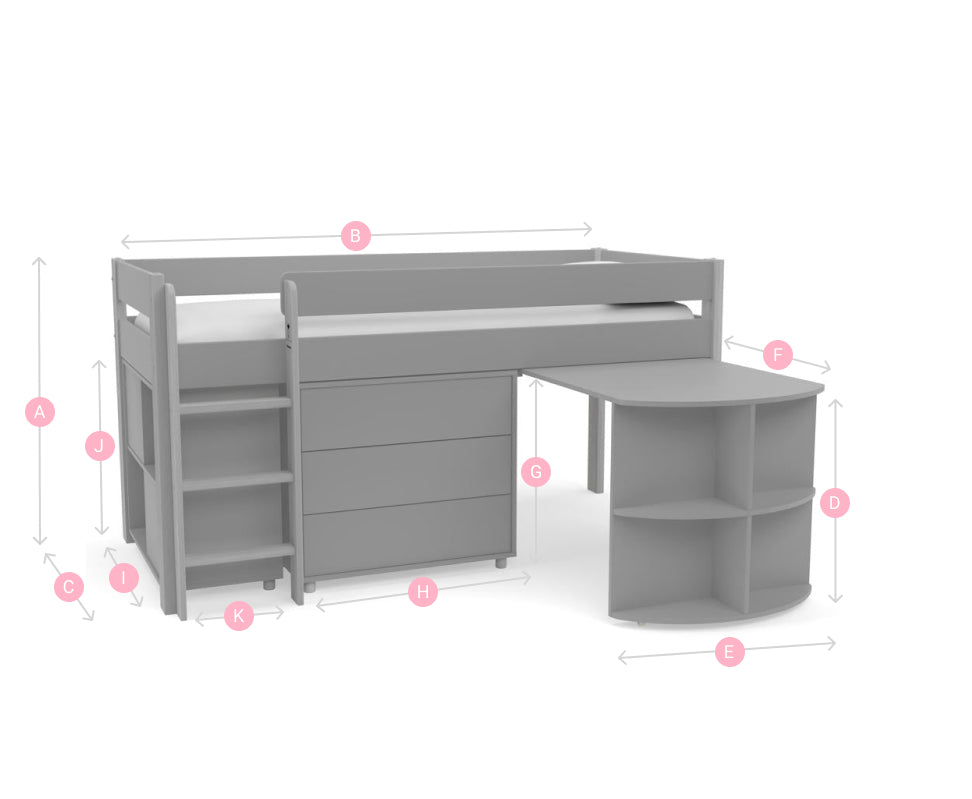 Discover the perfect blend of functionality, style, and space-saving innovation with our Uno Grey Midsleeper, featuring child-friendly rounded corners, a bed with wooden slats, a functional pull-out desk, and a chest and cube unit.