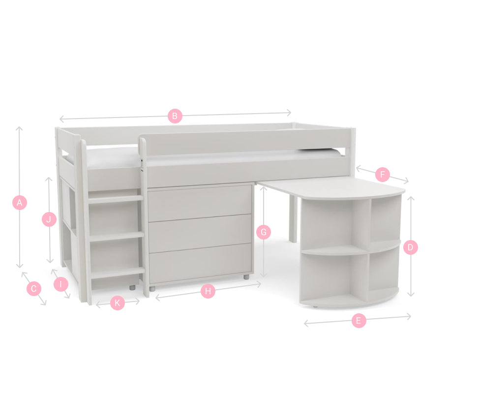 Transform your child's bedroom with the Uno White Midsleeper, a versatile and space-saving solution designed for modern living. This sturdy mid-sleeper bed seamlessly combines a comfortable sleeping area with a functional pull-out desk, a cube unit with push-to-open doors, and a convenient 3-drawer chest.
