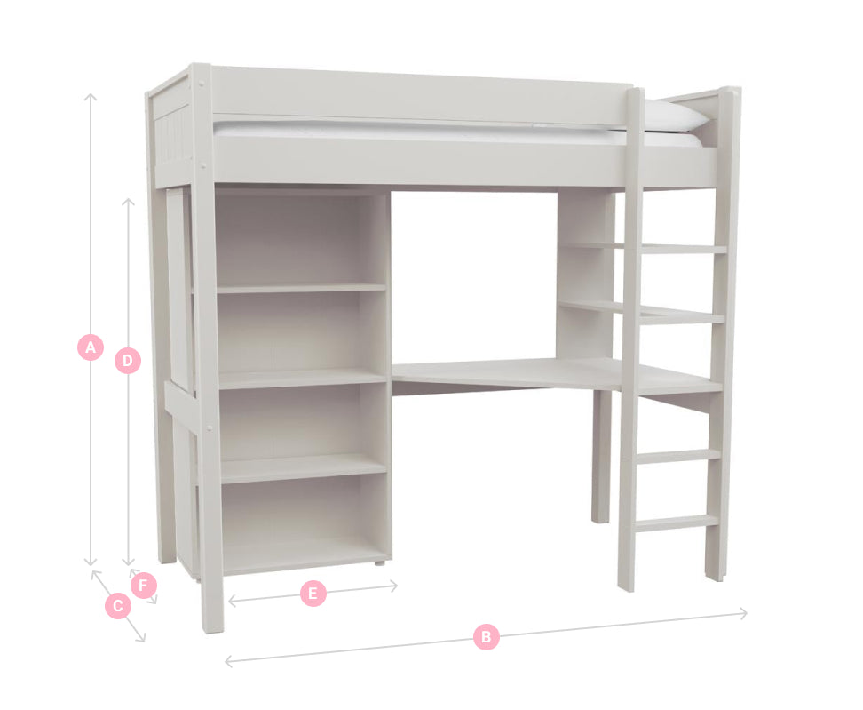 The Classic Kids High Sleeper is expertly designed to maximise the available space in your child’s room, similar to a cabin bed. The appeal of children’s loft beds lies in their ability to combine sleeping and functional areas. The integrated desk offers a dedicated workspace, while the shelving unit and tall bookcase provide ample storage for books, essentials, and decorative items, keeping everything neatly organised.