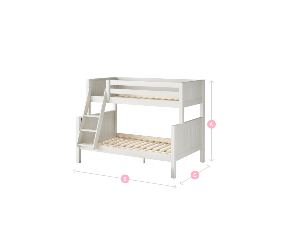 The bed features a slatted wooden base designed for optimal ventilation, which helps maintain the freshness and longevity of your mattress, creating a cosy and secure space for children. The ladder can be positioned on either the left or right side to perfectly fit your room layout, and the extra mattress depth adds an additional layer of safety. Furthermore, the bunk bed offers versatility as it can be split into separate beds—a single and a small double—catering to changing needs over time. The top bunk requires a single mattress, while the bottom bunk accommodates a small double mattress, making this trio bunk bed an ideal choice for parents seeking a stable, secure, and comfortable sleeping arrangement for their children.