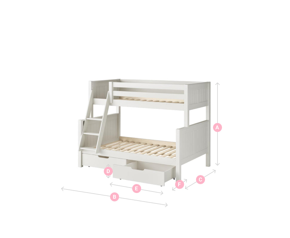 Moreover, this bunk bed is designed for versatility, easily converting into two separate beds—a single and a small double—to adapt to your changing needs over time. The top bunk requires a single mattress, while the bottom bunk fits a small double mattress, making this trio bunk bed an excellent choice for parents seeking a stable, secure, and comfortable sleeping arrangement for their children.