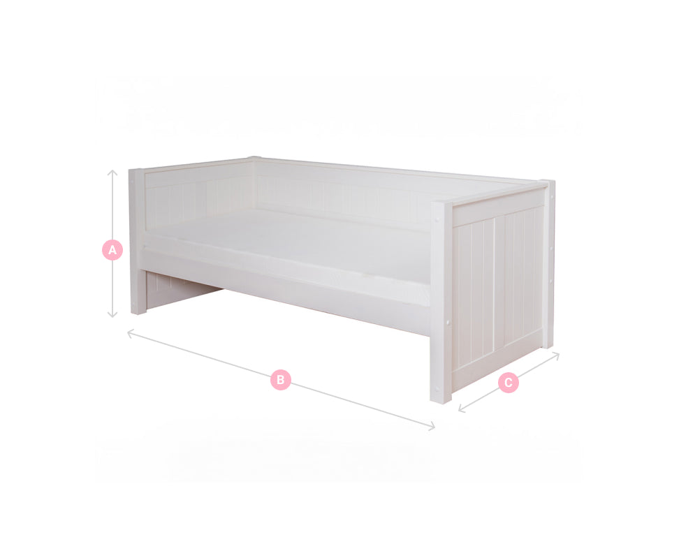 The Wooden Classic Kids Single Day Bed is a superb bed crafted from solid pine, featuring a sturdy bed frame with beautiful tongue and groove details on both the headboard and footboard, ensuring both durability and aesthetic appeal. This classic design is perfect for boys and girls of all ages, offering versatility that makes it ideal for a child's room, functioning as both a bed and a sofa. Its multifunctional design allows you to create a relaxing sofa space during the day and a comfortable sleeping space by night, making it a fun and functional option among day beds that adapts to your child’s needs. Additionally, this day bed helps save floor space in smaller bedrooms, making it a practical choice for children's rooms or as a guest bed in a spare room. The day bed maximises room space by providing extra space for other activities. Pair it with coordinating furniture and accessories to complete the look and enhance its functionality. A single mattress is required for this bed.